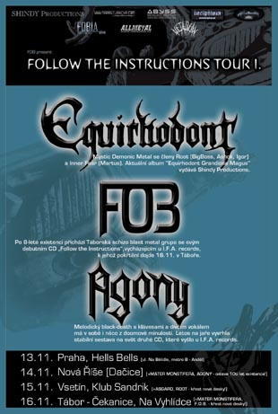 | V listopadu vyráží AGONY na FOLLOW THE INSTRUCTIONS tour spolu se skupinami EQUIRHODONT a F.O.B na podporu svých nově vydaných alb. Jednotlivé zastávky turné jsou uvedeny níže. Podrobné informace o připravovaném turné naleznete zde. | ||||||||||